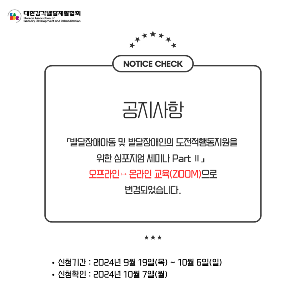 발달장애아동 및 발달장애인의 도전적행동 지원을 위한 심포지엄 세미나 Part Ⅱ 오프라인 교육이 실시간비대면 교육(zoom)으로 변경되었습니다.
