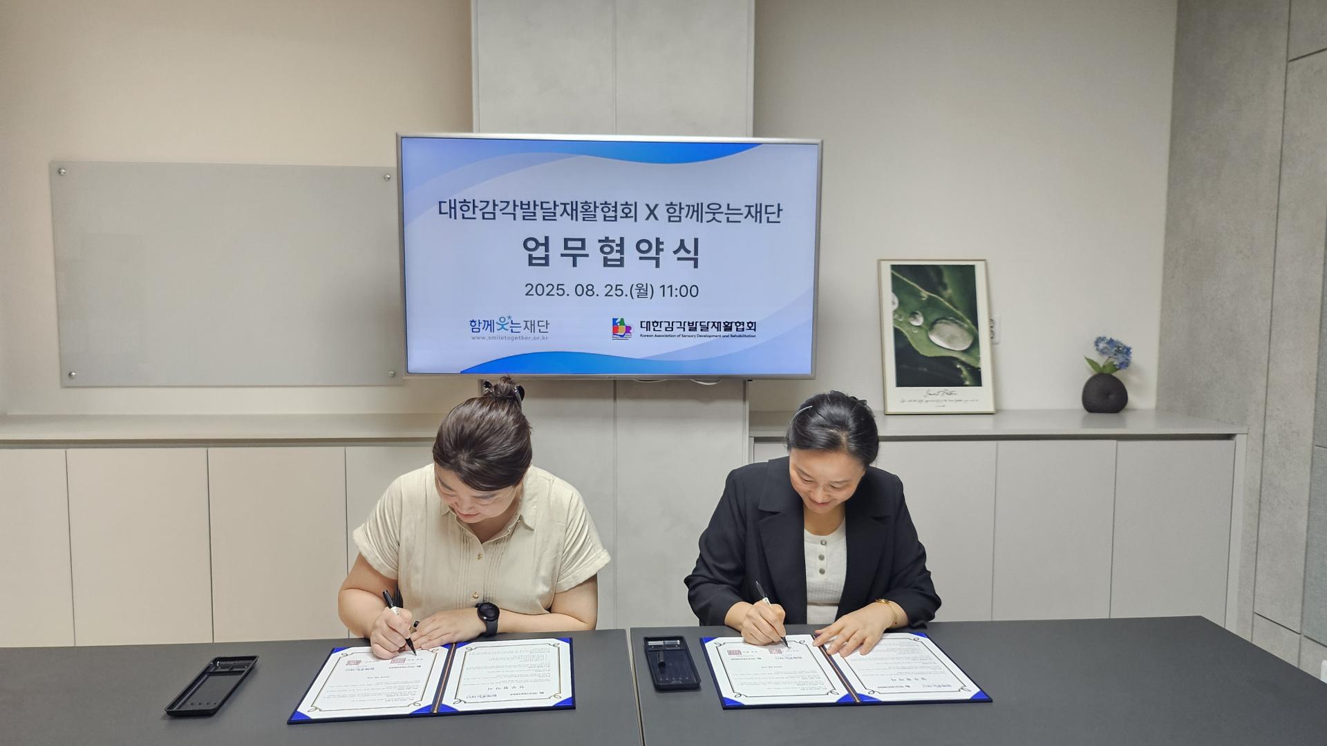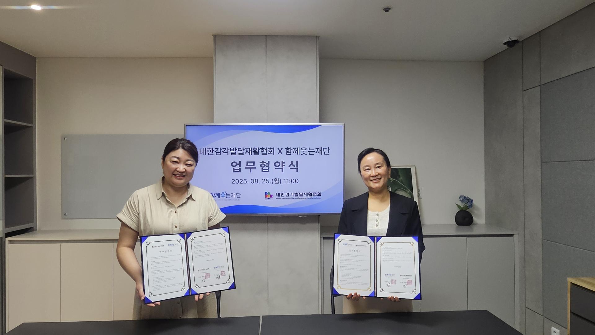 2025년 8월 25일 대한감각발달재활협회는 함께웃는재단과 업무 협약식을 진행하였습니다.